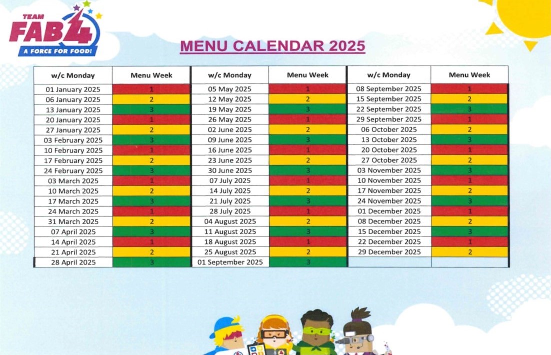 Our school meal menu is based on a three-week rota. Find out which week we are on vy viewing the menu calendar below.